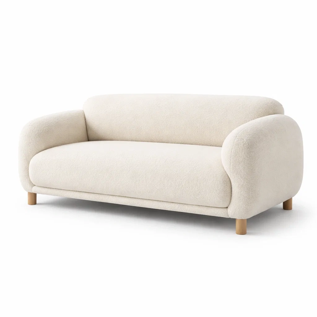 Canapé trois places en tissu bouclé blanc avec pieds en bois